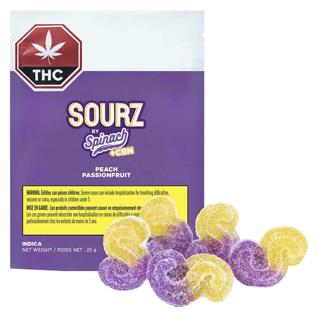 Dive into peach and exotic passionfruit flavours with SOURZ by Spinach Peach Passionfruit 1:1:1 CBN:CBD:THC soft chews. With a ratio of 2 mg of CBN, 2 mg of CBD and 2 mg of THC per soft chew. These dual flavoured soft chews with sour crystals are over-the-top with natural flavours.